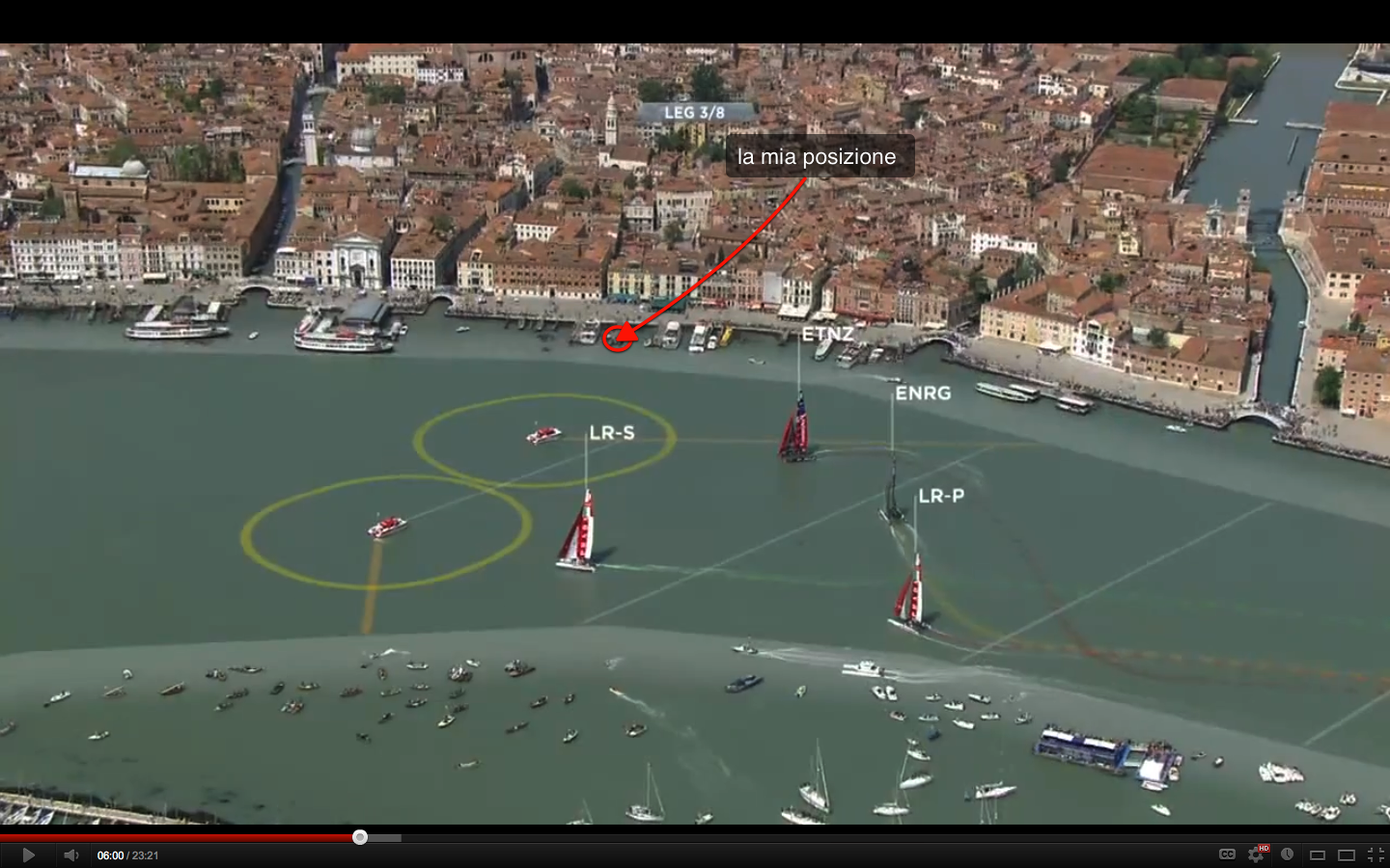 La mia posizione è ottimale secondo il campo di gara, bacino San Marco, lo specchio d’acqua antistante alla splendida città di Venezia, location unica . ( immagine tratta dal video che si trova in fondo all’articolo).