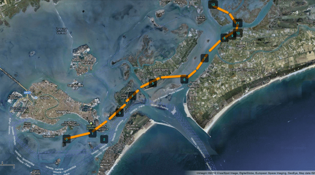 Breve ricostruzione percorso del tornado che ha colpito la città di Venezia e la parte settentrionale della laguna. 12 giugno 2012