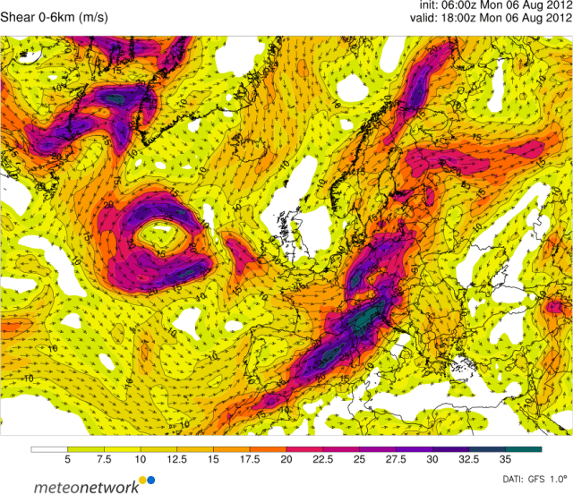Tenderà quindi a crearsi uno shear positivo in direzione e velocità con venti che ruoteranno in senso orario con la quota e aumenteranno progressivamente di intensità con la stessa, intensificando così i moti ascensionali.
