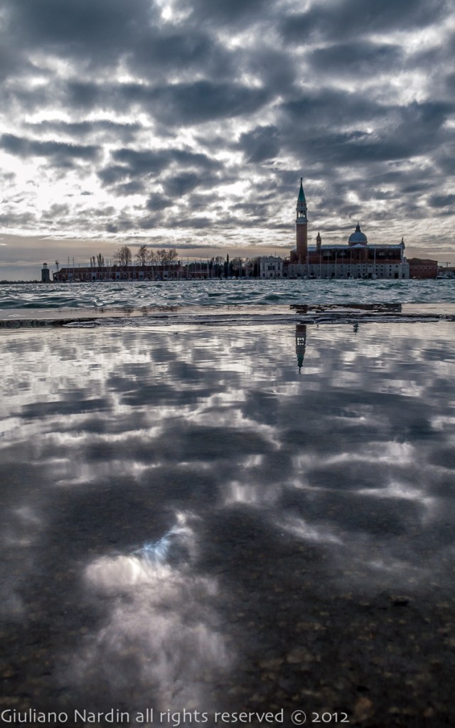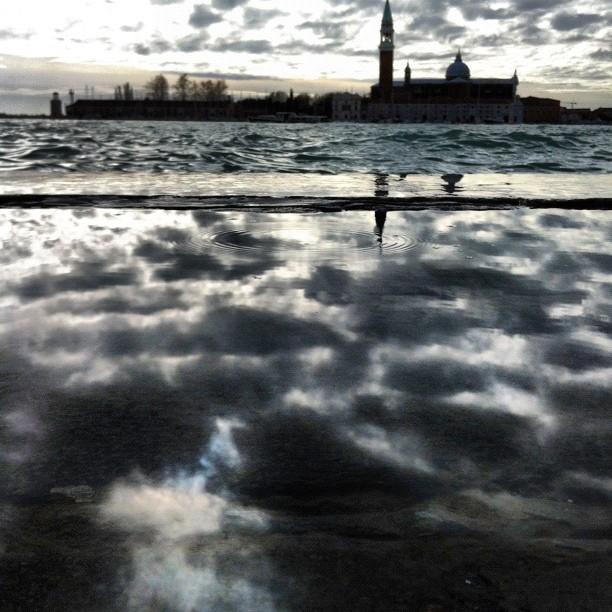 Dopo il peggioramento meteo, finalmente arriva il sole, nelle immagini il cielo riflesso in una pozzanghera lasciata dall’alta marea in riva degli Schiavoni Venezia, sullo sfondo l’Isola di San Giorgio .