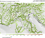 Il “potenziale temporalesco” tra Veneto ed Emilia invece ieri è rimasto intonso, e potrebbe esser stato ulteriormente rinvigorito dall’aria umida spinta dai temporali che sono arrivati morenti (e quindi non più in grado di rovesciare aria secca al suolo) fin verso la linea rossa.