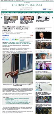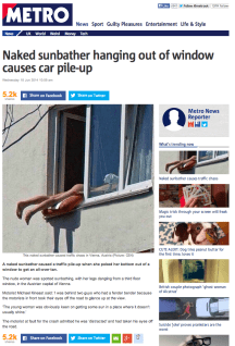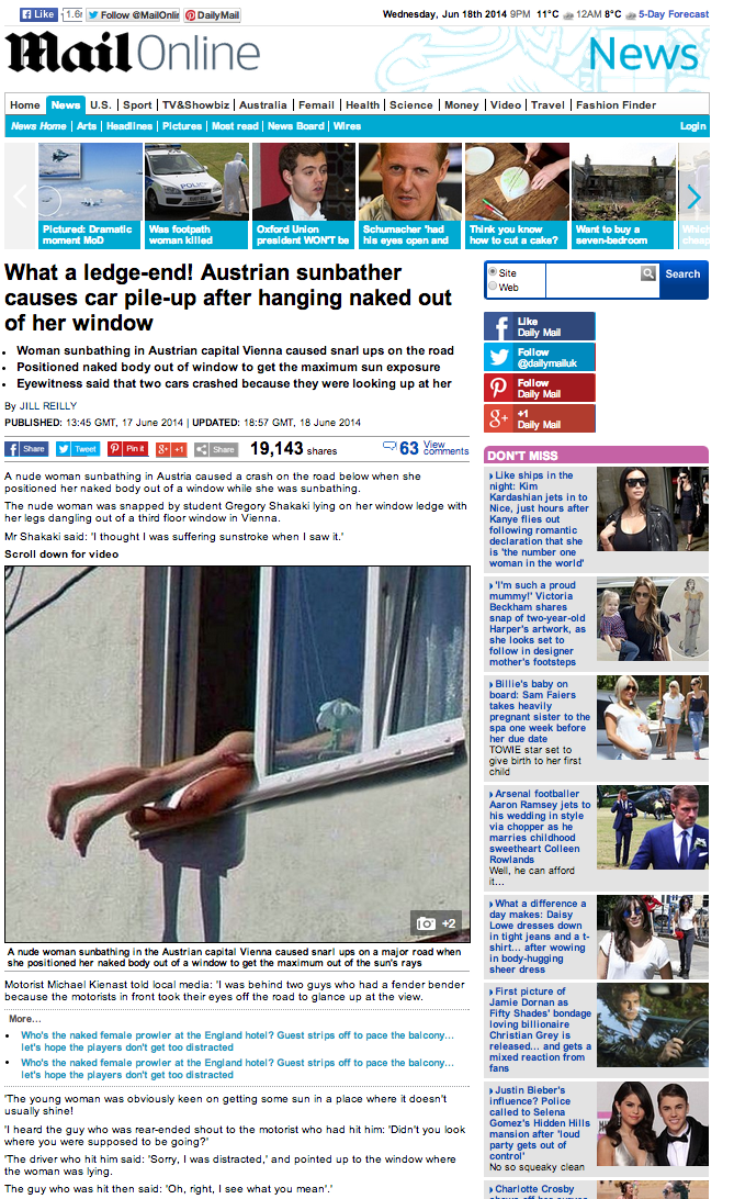 Il Mattino pubblica questa notizia nella sezione Primo piano / Cronaca: “Prende il sole tutta nuda fuori dalla finestra: la ragazza provoca un tamponamento”. Secondo l’articolo, nel centro di Vienna una ragazza s’è messa a prendere il sole nuda, con le gambe fuori dalla finestra. Addirittura due ragazzi si sono tamponati in auto a causa dello “spettacolo” [sic]. C’è anche il testimone, Michael Kineast. E soprattutto c’è la foto dello “spettacolo” in questione.