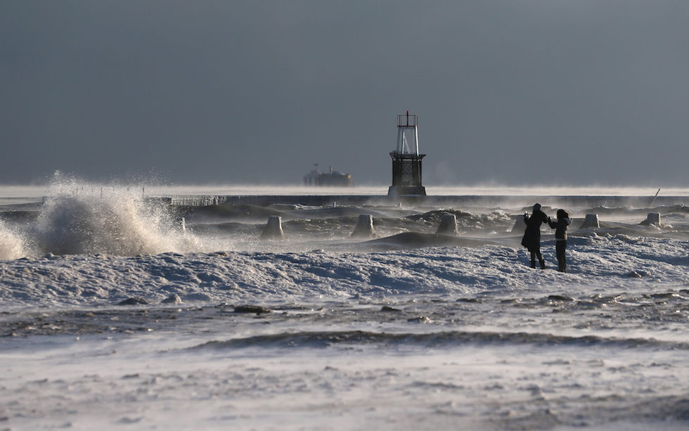 North Avenue Beach sul lago Lake Michigan, Chicago, Illinois, 7 gennaio 2015.
