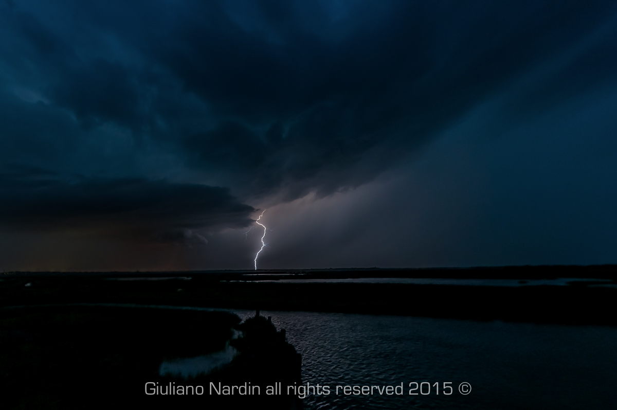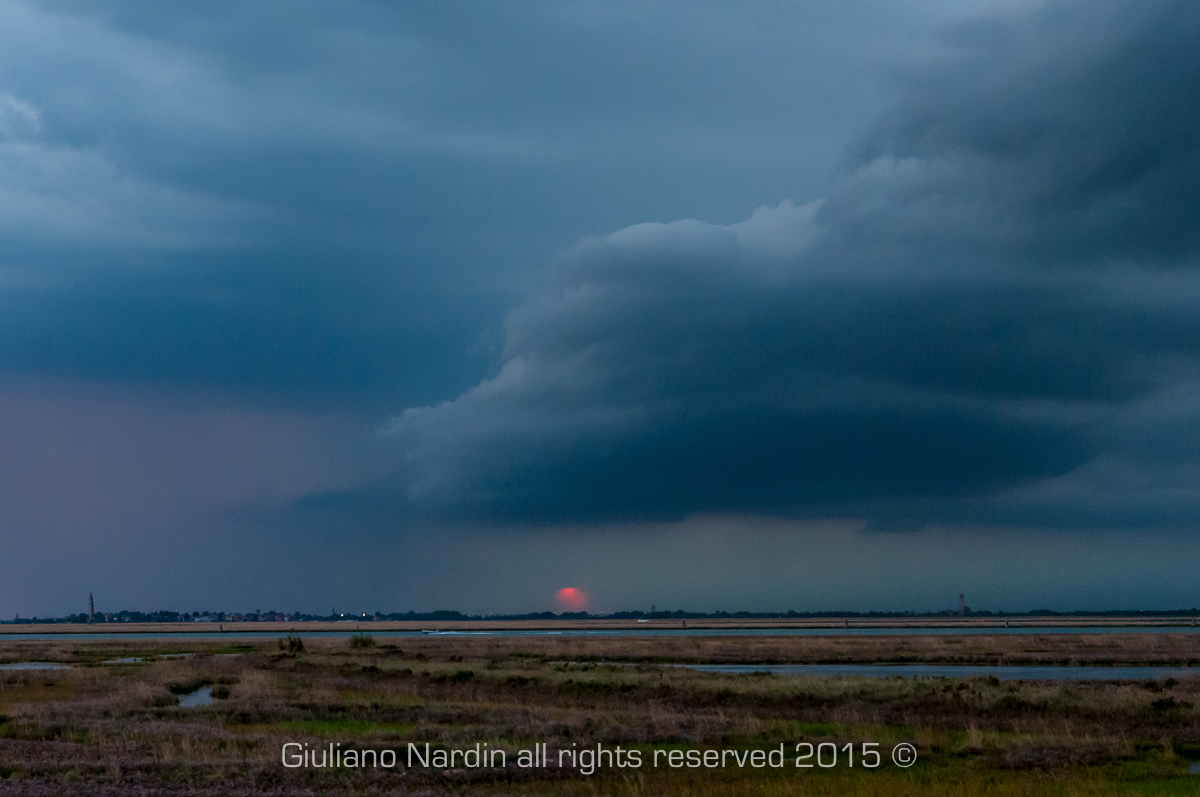 Treporti (VE) 20 agosto 2015, giornata caratterizzata dalla formazione di diversi cumulinembi nell’entroterra Veneto e Friulano, ma solo verso sera sarà il nostro turno, cella temporalesca in formazione con spettacolare shelf-cloud