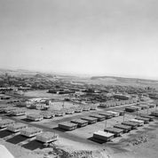 Aerial View of Dhahran from Corner of 16th and “L” Streets, Building Under Construction is the Theater, Dhahran, September 14, 1949.