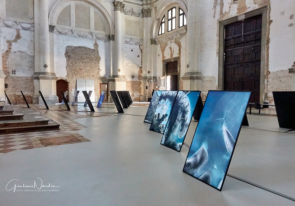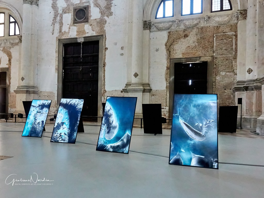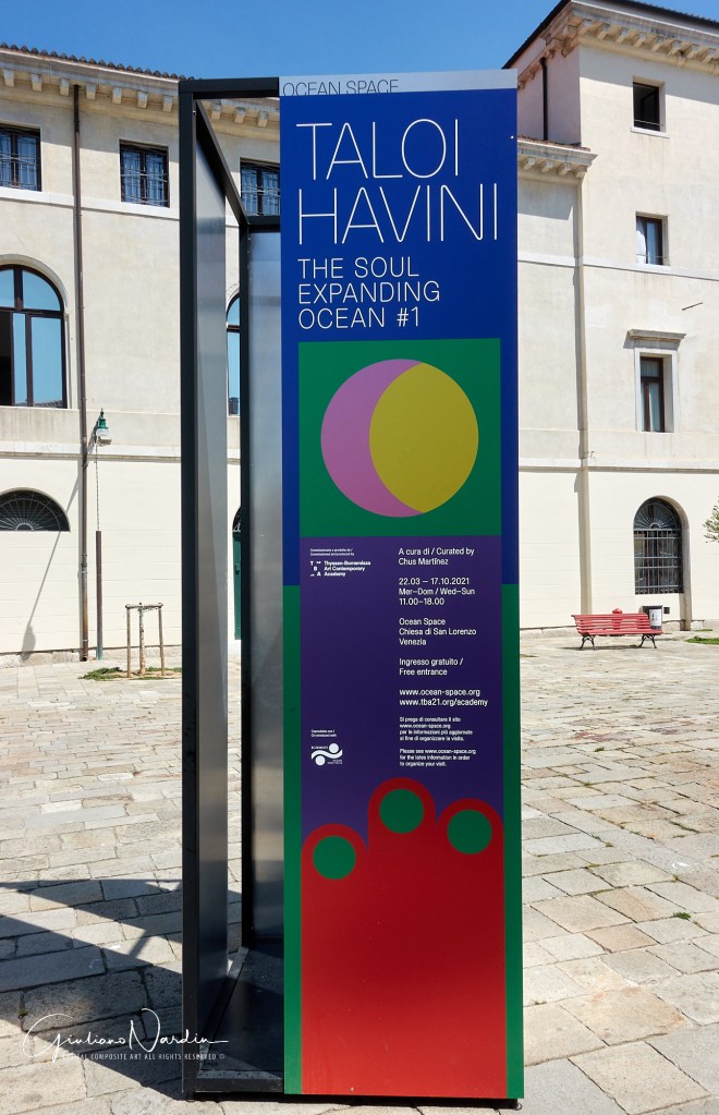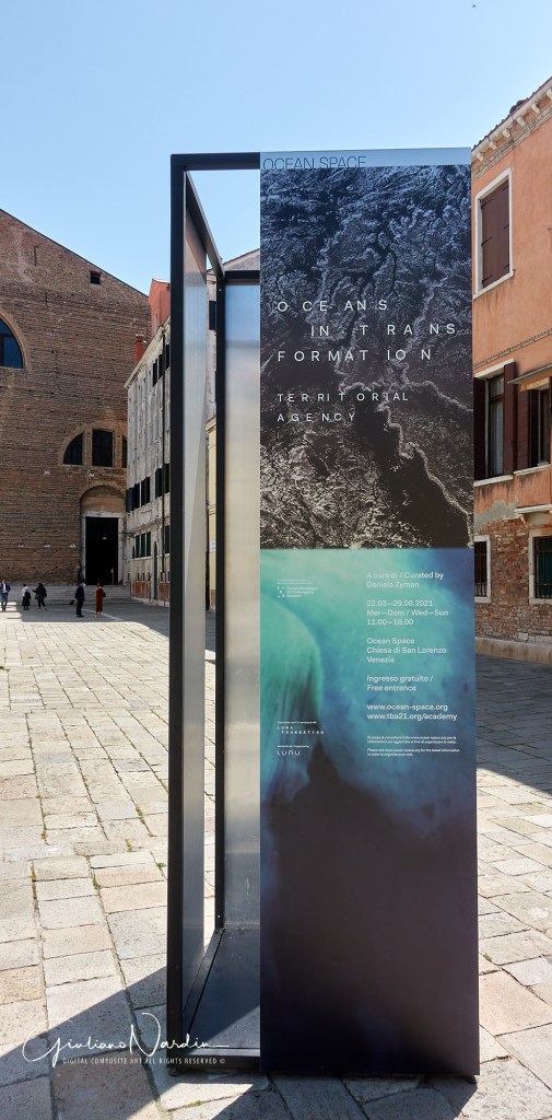 L’Ocean Space esiste a Venezia dal 2019 e si trova nella Chiesa di San Lorenzo, grande e imponente. Al suo interno si svolgono le attività della TBA21-Academy, organizzazione d’arte contemporanea dedicata ai temi marini, itinerante e paneuropea che ora però ha trovato nella laguna veneziana lo spazio (e l’osservatorio) più adatto. Sulla facciata, un neon blu indica il livello previsto di innalzamento del mare entro fine secolo a Venezia mentre all’interno si trovano due mostre. La prima è il secondo capitolo di Territorial Agency: Oceans in Trasformation e occupa tutta la navata principale all’ingresso spiegando, attraverso circa trenta schermi e un grande tavolo, un’estesa indagine sui rapidi cambiamenti degli oceani, restituiti attraverso una veste grafico-geografica, ma che coinvolgono anche arti, scienza, politica e soprattutto storia antropologica.