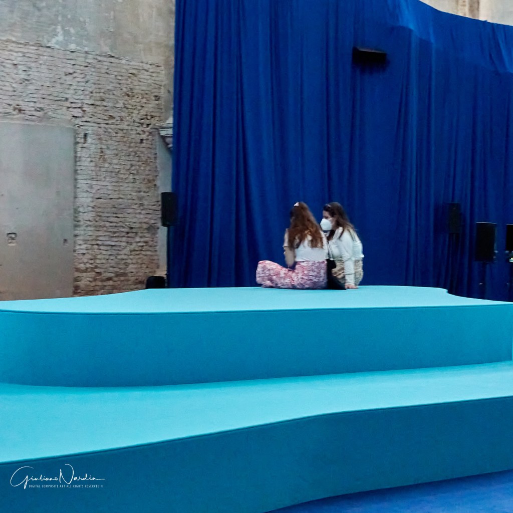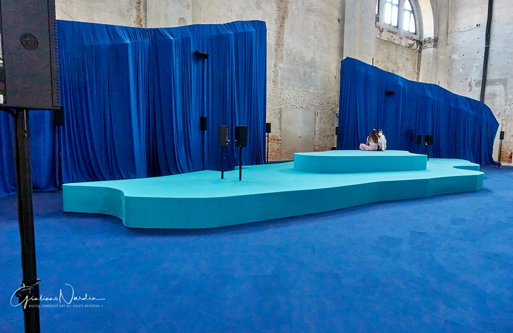 La seconda invece, Soul Expanding Ocean #1, è una grande installazione site-specific di Taloi Havini che si intitola Answer to the Call e consiste in un’opera sonora a 22 canali che mescola registrazioni subacquee d’archivio con racconti in lingua Hakö degli antenati navigatori dell’artista. Per immergersi completamente in quest’esperienza auditiva, Havini ha anche progettato nell’ampia zona dietro l’altare una scenografia teatrale nei toni del blu dove un “isola” centrale riproduce la forma di Buka (terra natia dell’artista a Bougainville), sulla quale il visitatore è invitato a sovvertire la prospettiva solitamente associata all’esplorazione scientifica.