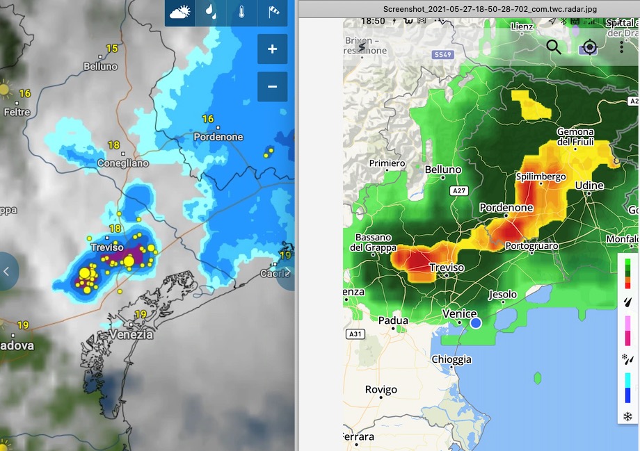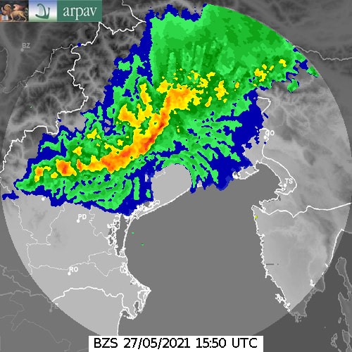 Squall line temporalesca in discesa dal pedemontano veneto sulla pianura , immagine radar Arpa Veneto