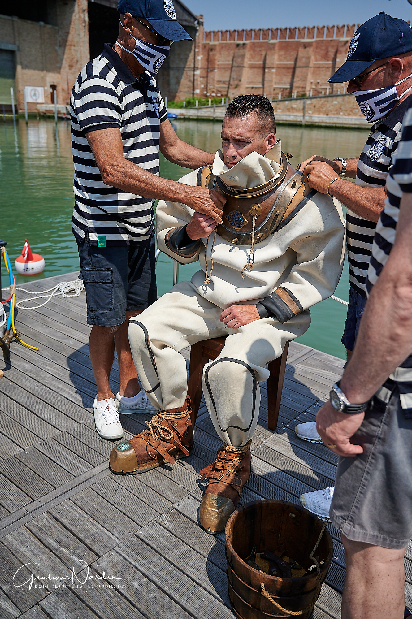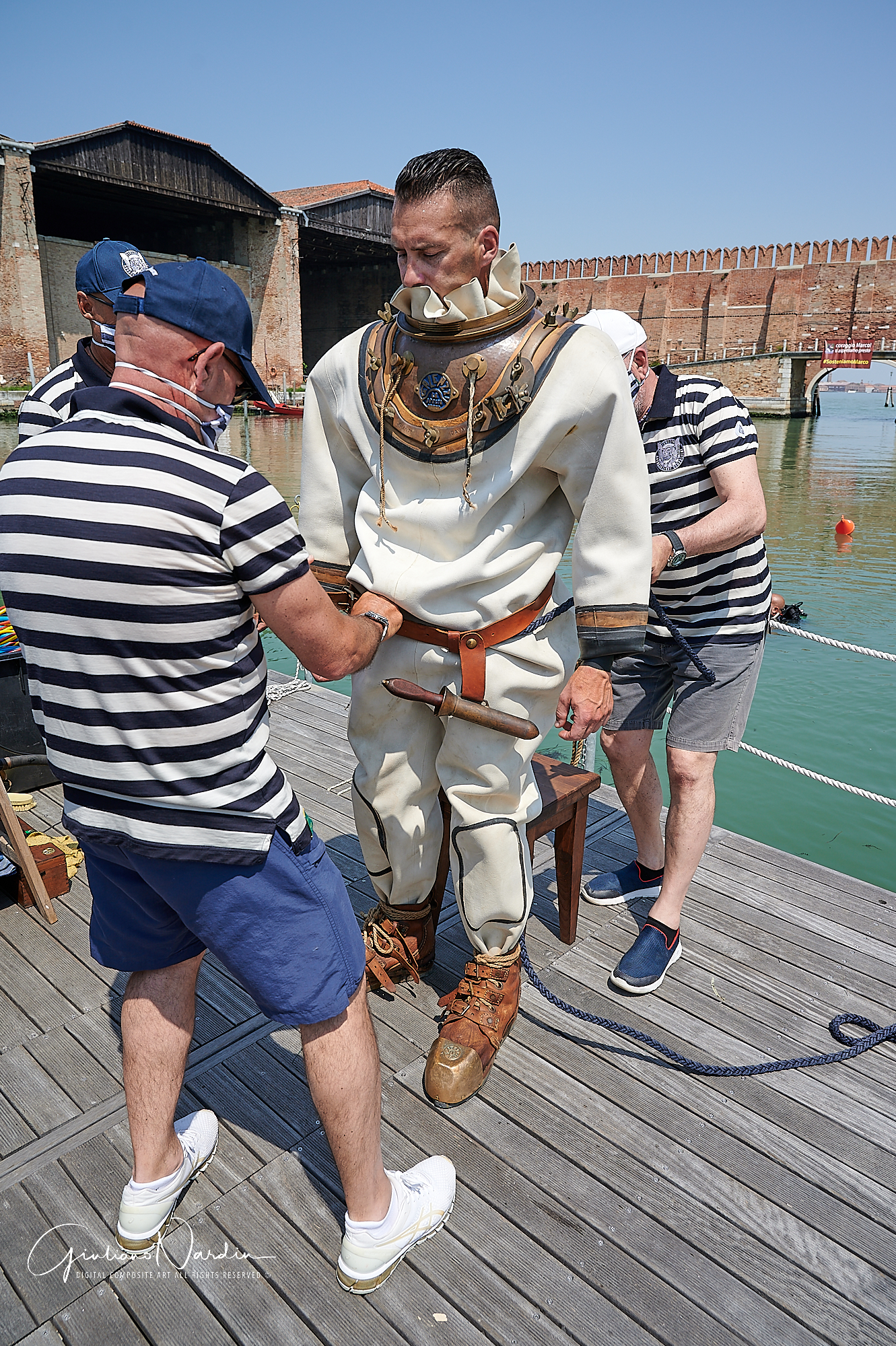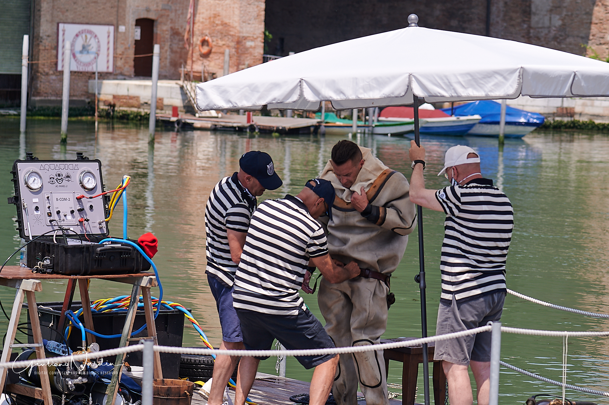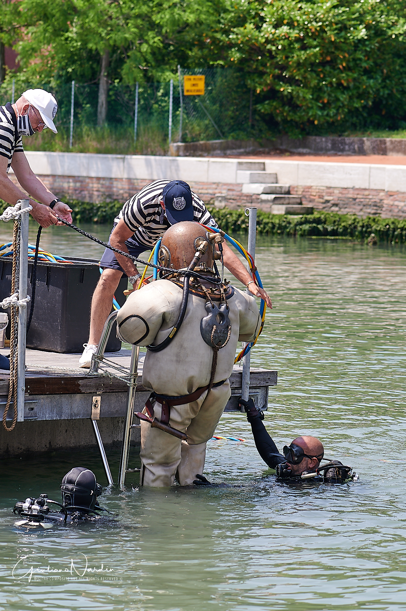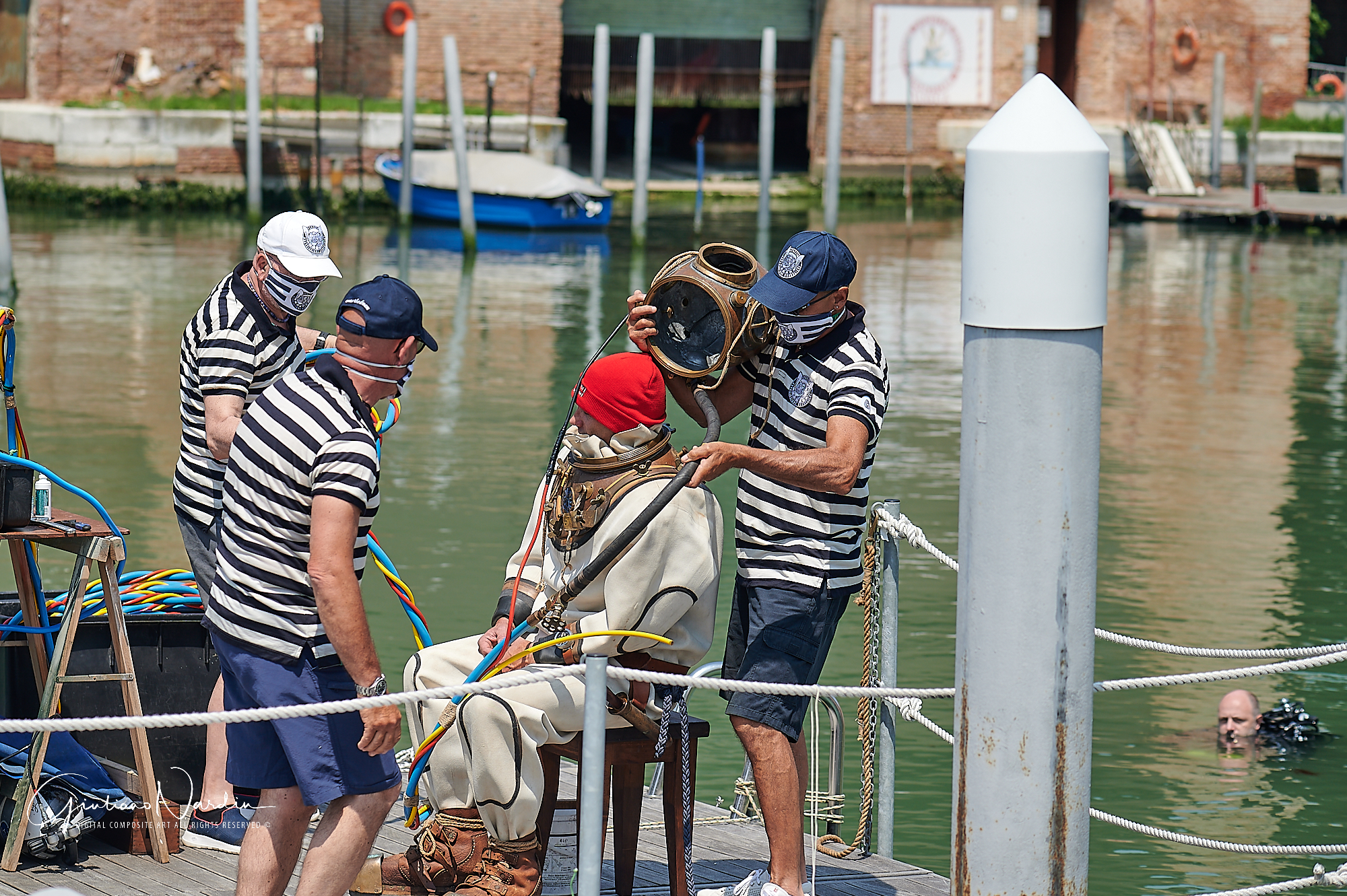 “Immersioni con caschi professionali”, “Aquatica” e “Club Subaqueo San Marco” si sono immersi a scopo dimostrativo nelle acque dell’Arsenale di Venezia, in Rio delle Galeazze, con attrezzatura d’epoca e moderna per rievocare le antiche tecniche di immersione e raccontare al pubblico come, oggi, lavorano questi professionisti della subacquea per ripulire le acque e contribuire alla protezione dell’ambiente lagunare.
