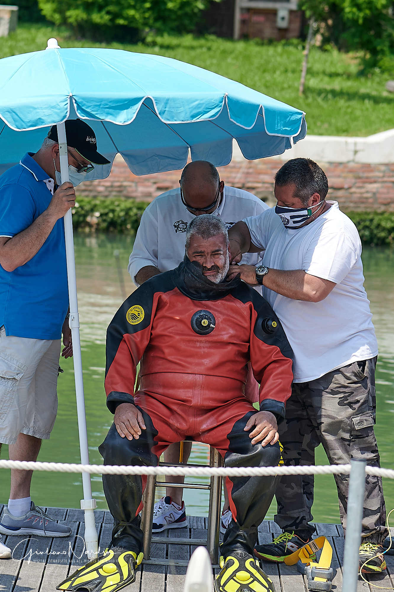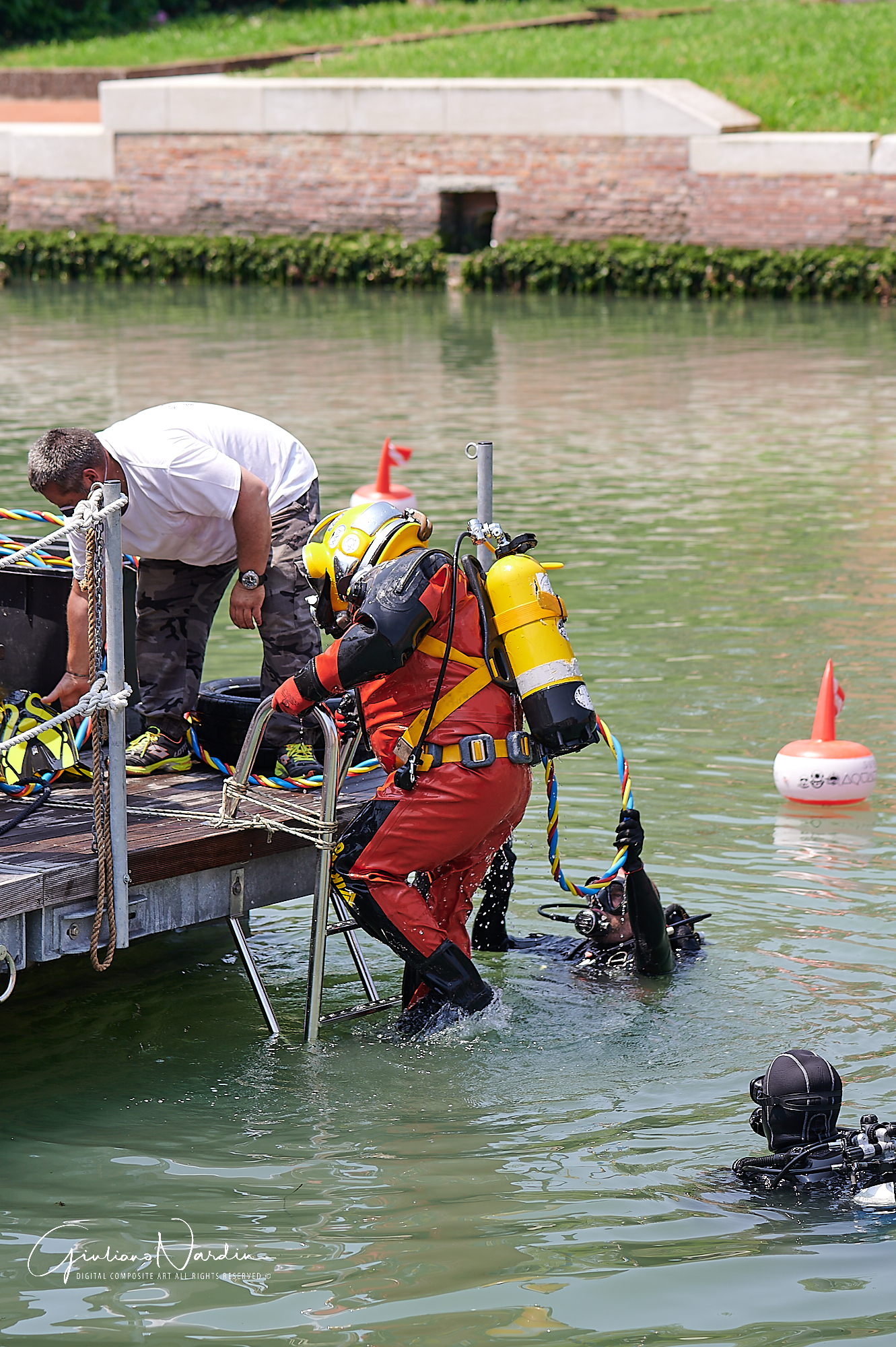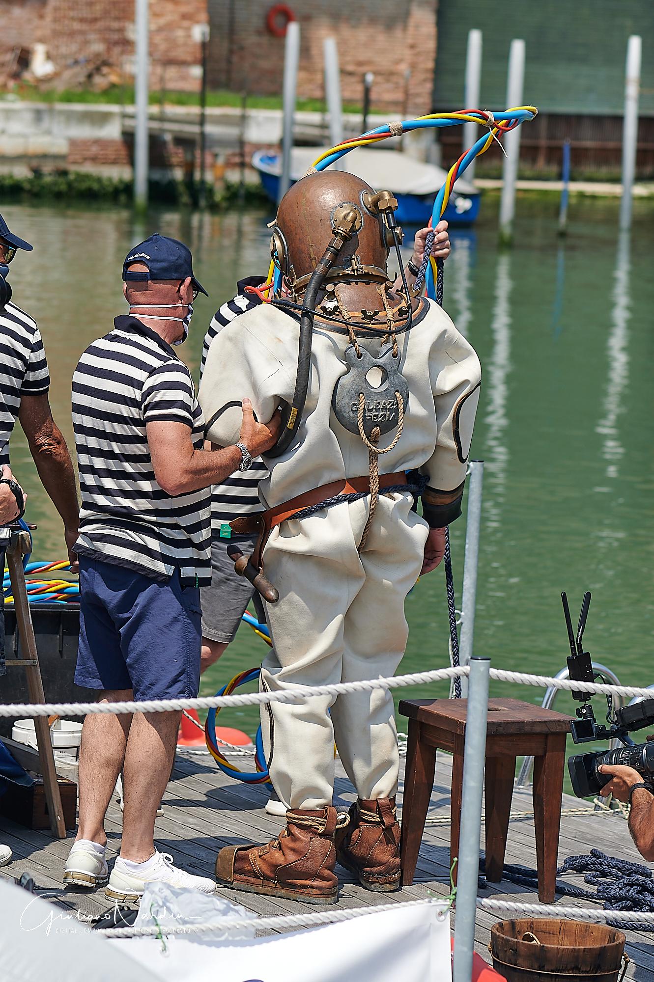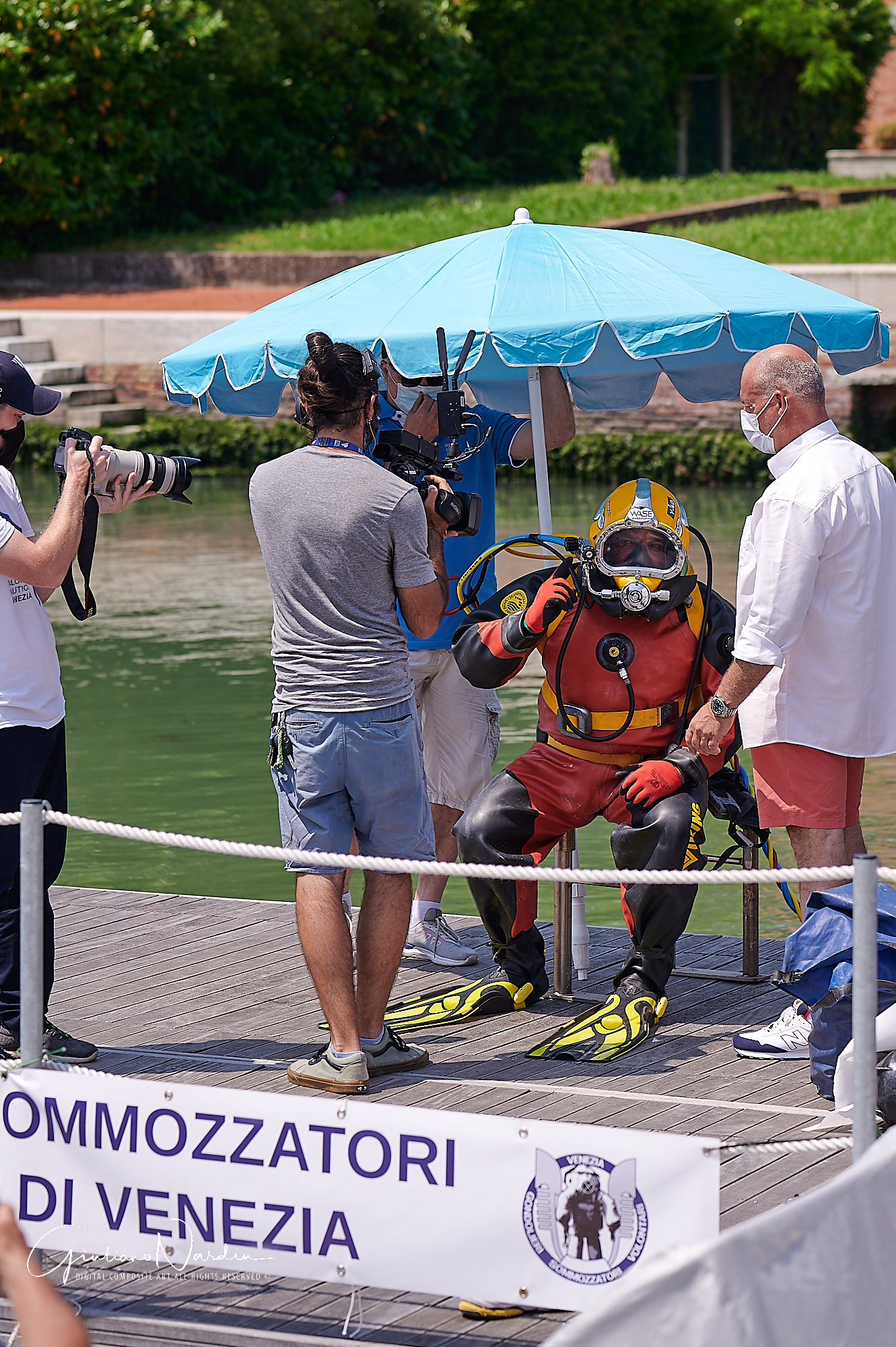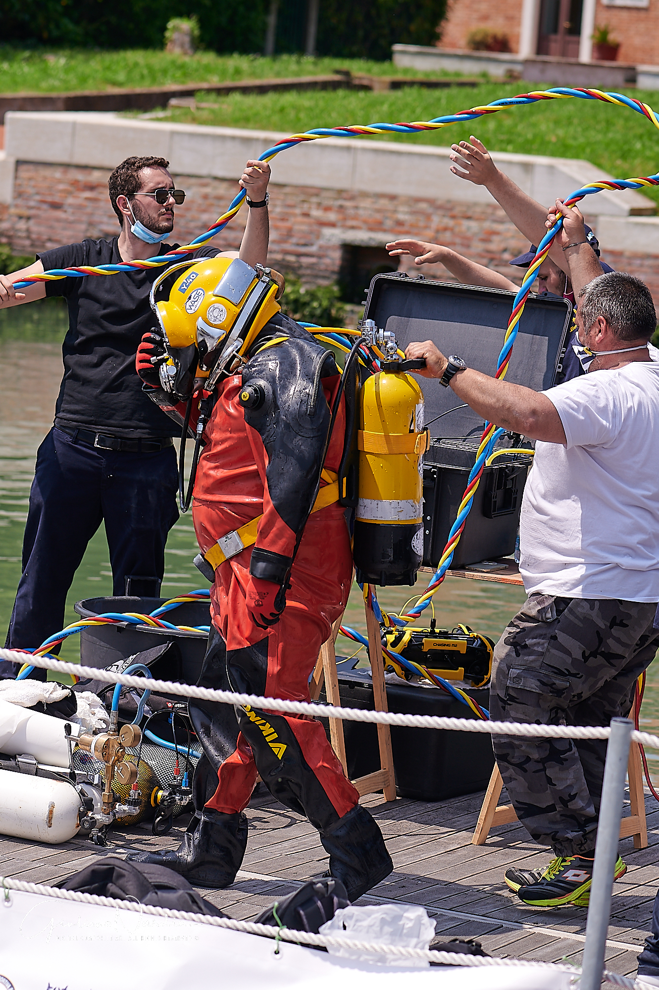 “Immersioni con caschi professionali”, “Aquatica” e “Club Subaqueo San Marco” si sono immersi a scopo dimostrativo nelle acque dell’Arsenale di Venezia, in Rio delle Galeazze, con attrezzatura d’epoca e moderna per rievocare le antiche tecniche di immersione e raccontare al pubblico come, oggi, lavorano questi professionisti della subacquea per ripulire le acque e contribuire alla protezione dell’ambiente lagunare.