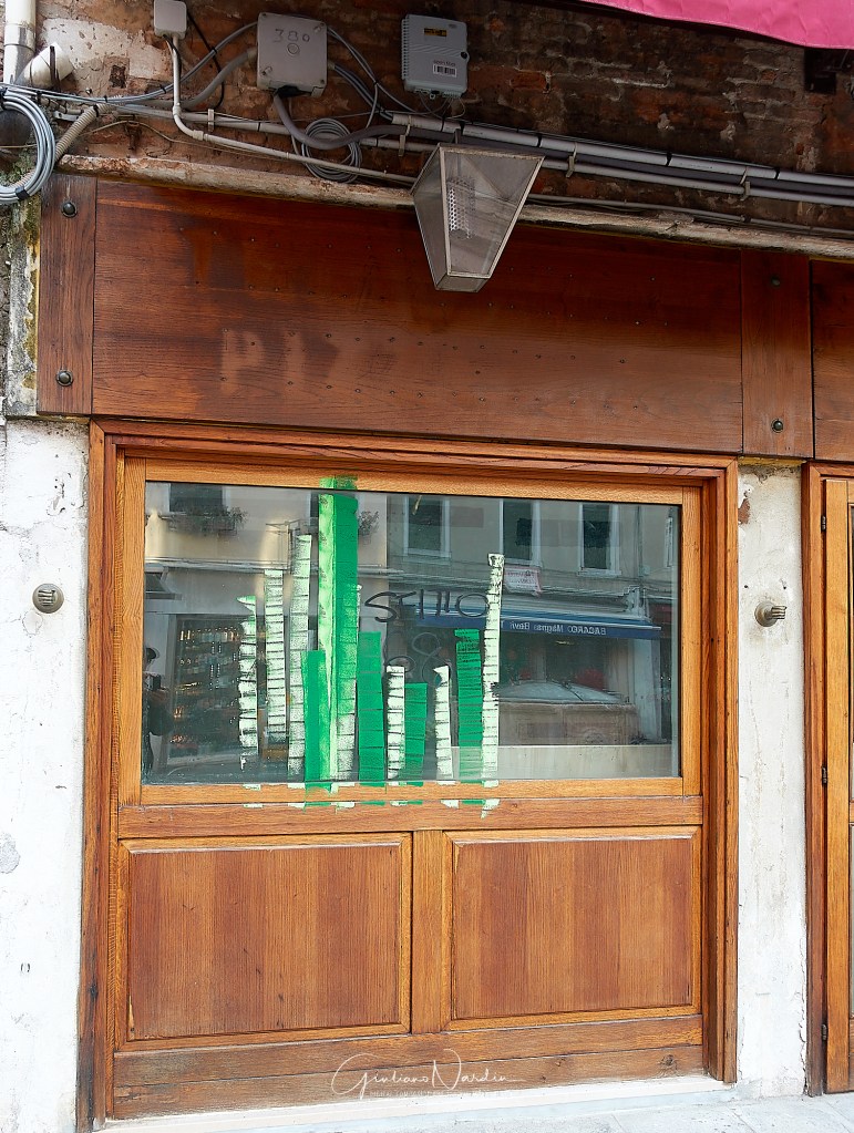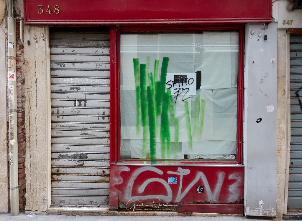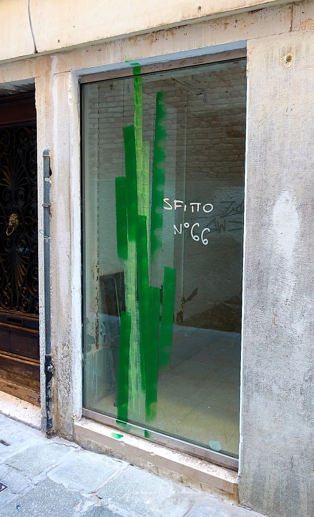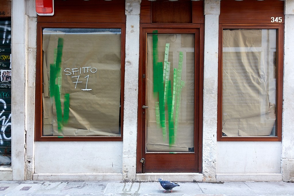 Negozi contati e “spuntati” con dei segni verdi accompagnati dalla scritta “sfitto”. Blitz dell’artista Freak of Nature in laguna, nella notte tra sabato e domenica, che ha censito i negozi vuoti e abbandonati della città con forme di bambù stilizzato sulle vetrine.