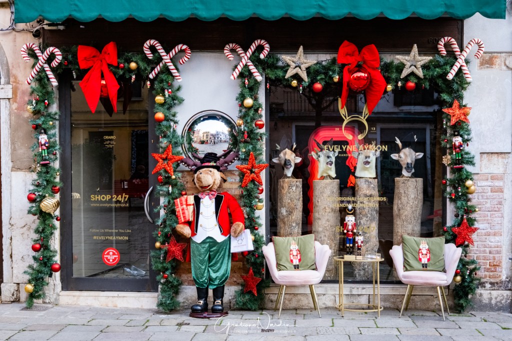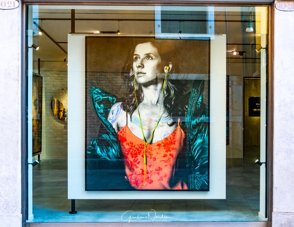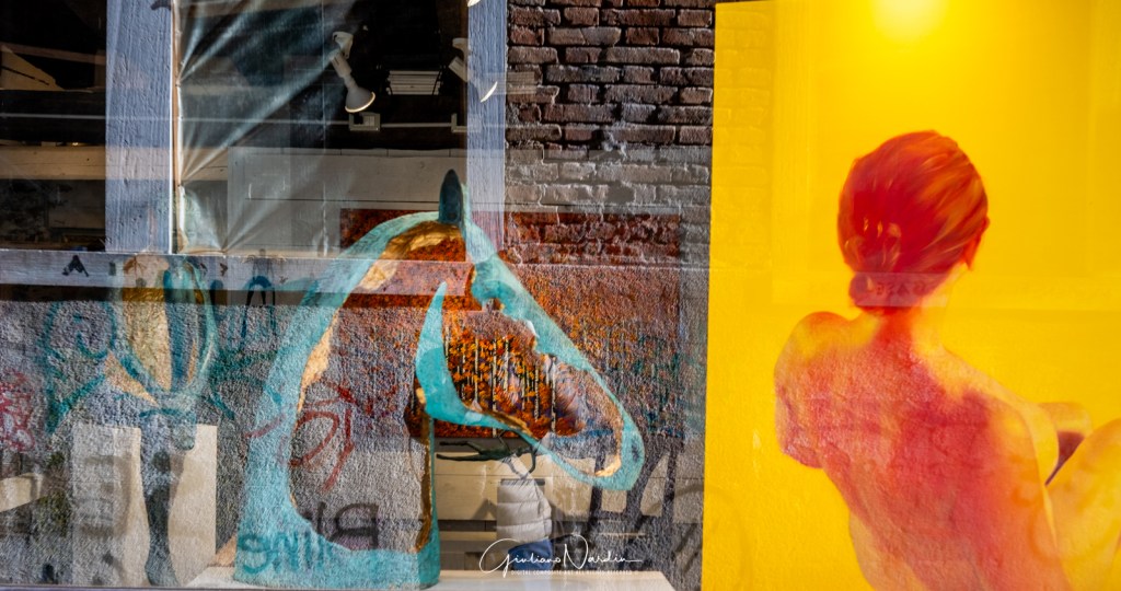 From opulent shop windows that mix the coral red of dresses with the acid green of a modern coat, a contemporary Venice emerges—one that dialogues with its history through bold contrasts. Color becomes the true protagonist: we find it in the deep, regal blue of a damask fabric cradling a shimmering mask, or in the sun-yellow exploding within a reflected work of art, as if to challenge the shadows of the exposed brickwork.