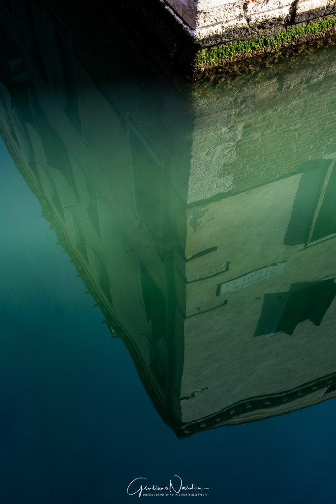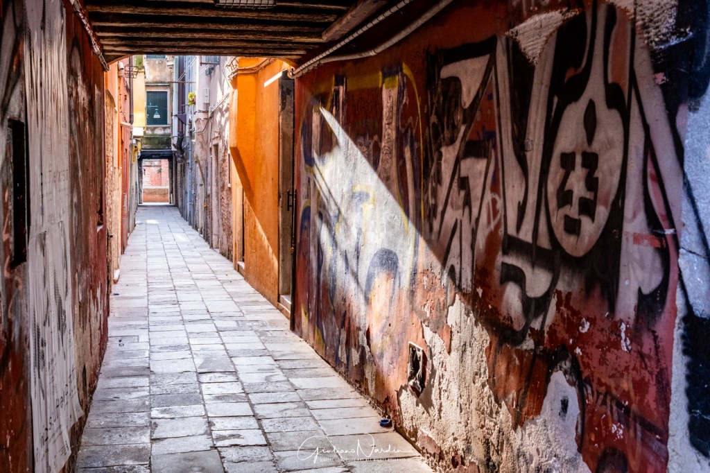 Particolarmente suggestiva è la gestione dei riflessi acquatici. L’immagine dell’edificio ribaltato nel canale non è solo un gioco geometrico, ma una fusione di toni pastello e riflessi smeraldo, dove la realtà si fa liquida e astratta. Anche i vicoli più stretti, solitamente cupi, si accendono grazie a sprazzi di luce che colpiscono pareti sature di graffiti, dimostrando che Venezia è una tela in continua evoluzione.