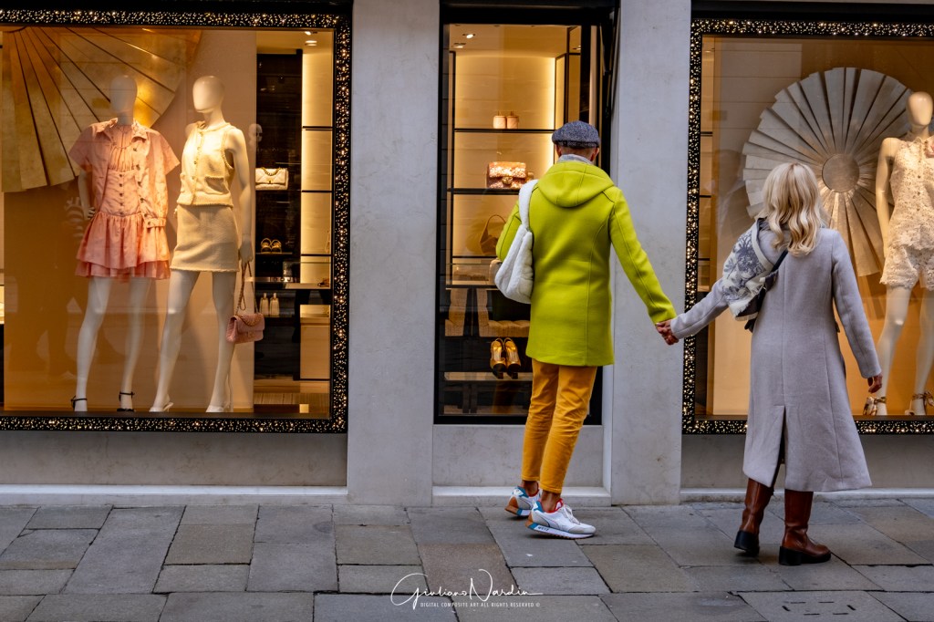 Dalle vetrine sfarzose che mescolano il rosso corallo dei vestiti al verde acido di un cappotto moderno, emerge una Venezia contemporanea che dialoga con la sua storia attraverso contrasti audaci. Il colore diventa il vero protagonista: lo ritroviamo nel blu profondo e regale di un tessuto damascato che accoglie una maschera scintillante, o nel giallo solareche esplode in un’opera d’arte riflessa, quasi a voler sfidare l’ombra dei mattoni a vista.