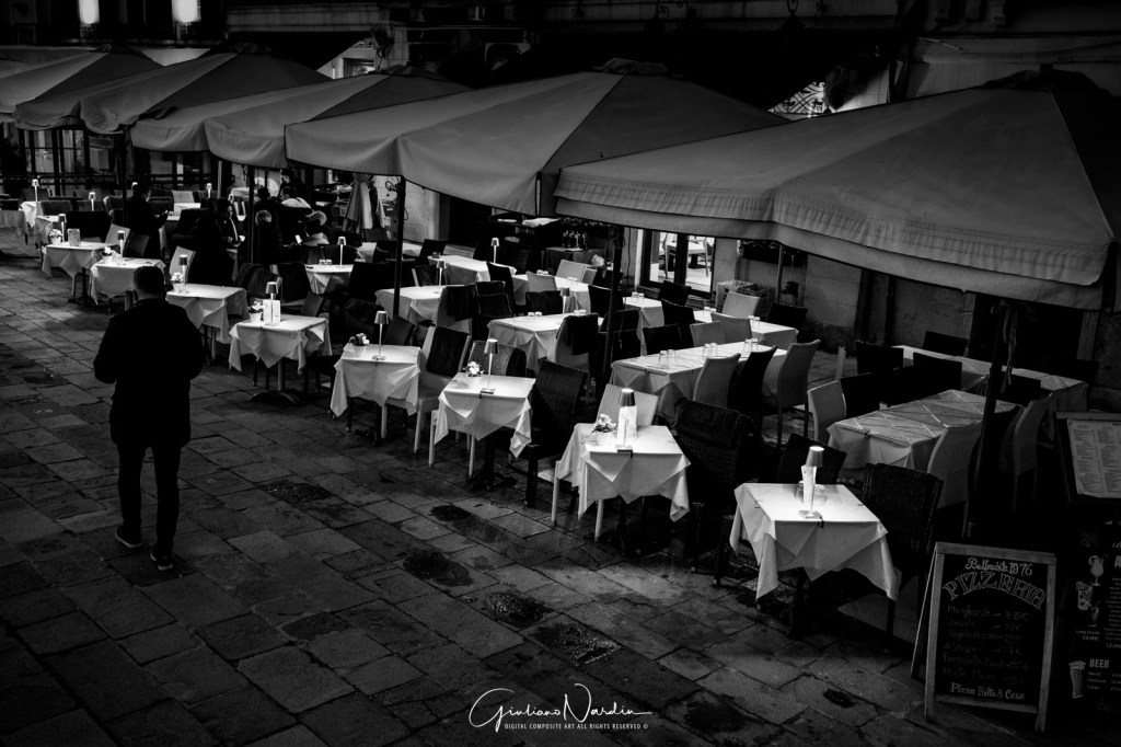 I chose black and white because Venice, at night, is a matter of contrasts. It’s the deep black of the porticos challenging the warm glow of the lamps; it’s the texture of the masegni paving stones that only emerges once color is stripped away.