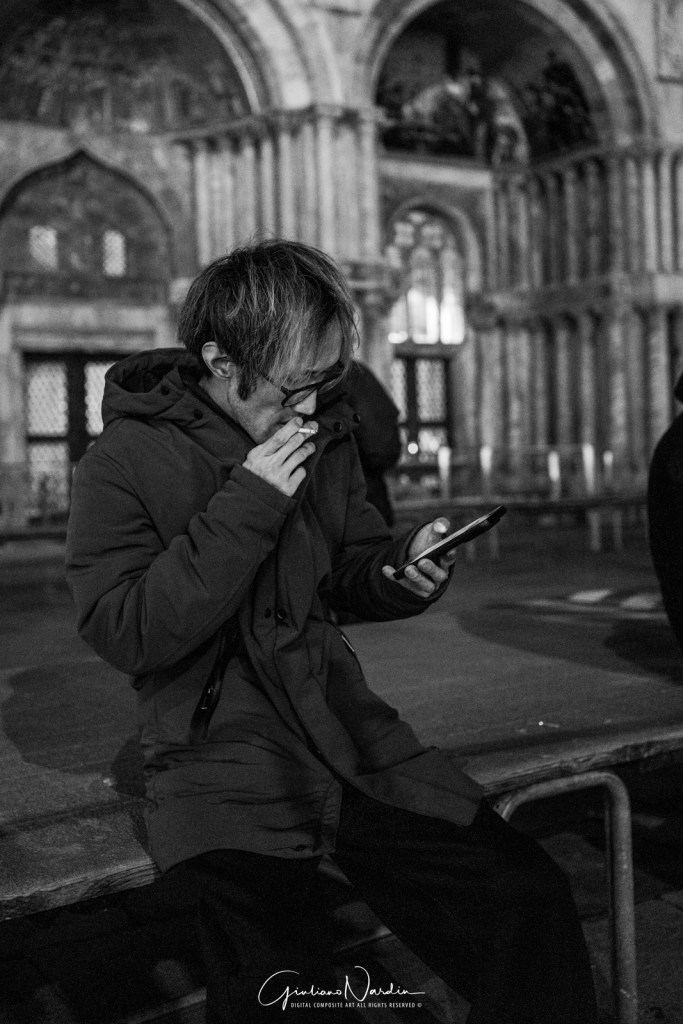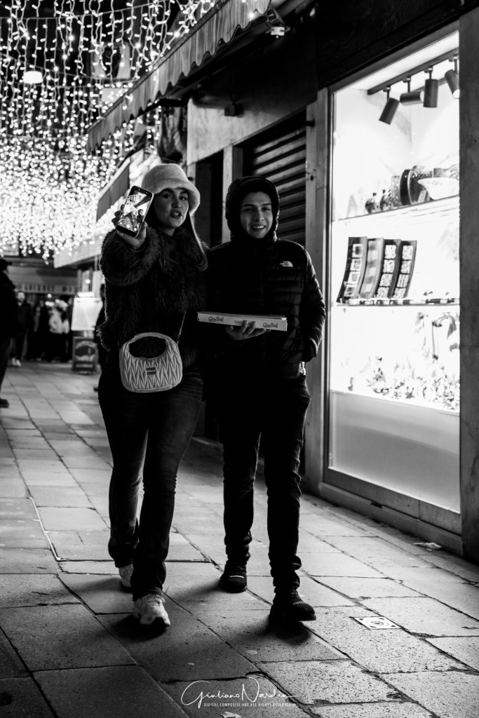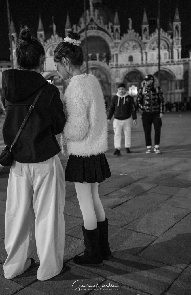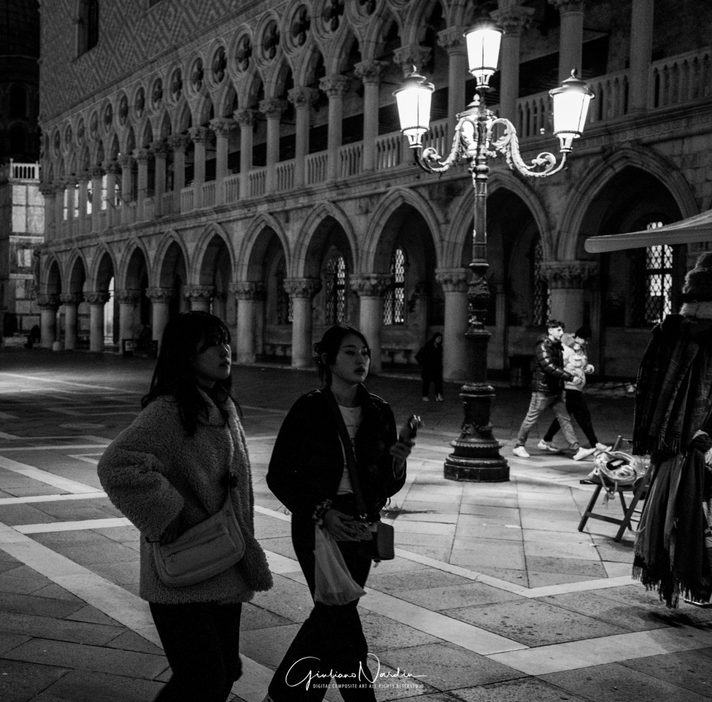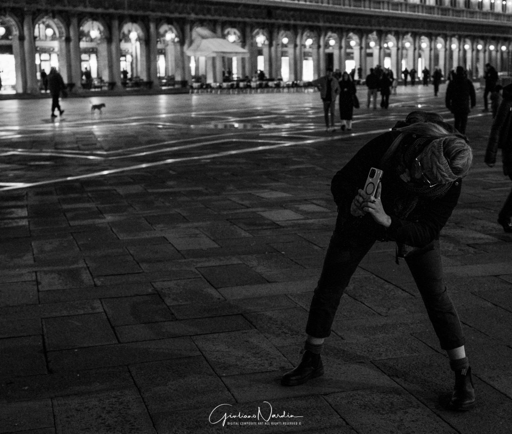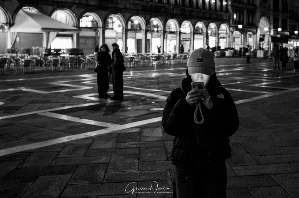 - La Venezia quotidiana: Le silhouette dei passanti che fluttuano sopra i propri riflessi, le luci fredde dei display degli smartphone che illuminano i volti, creando un ponte tra la storia millenaria e la nostra frenetica modernità.