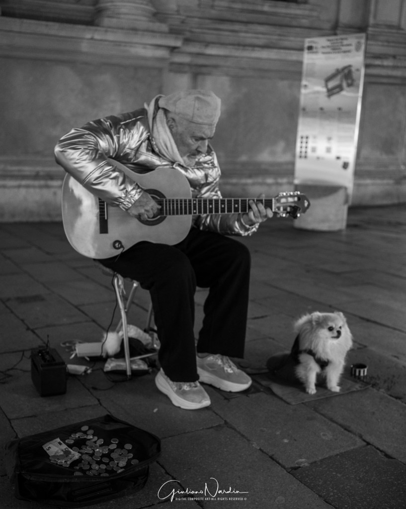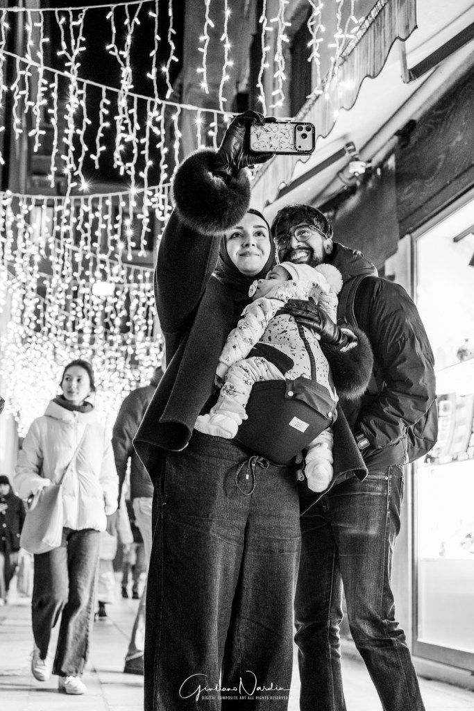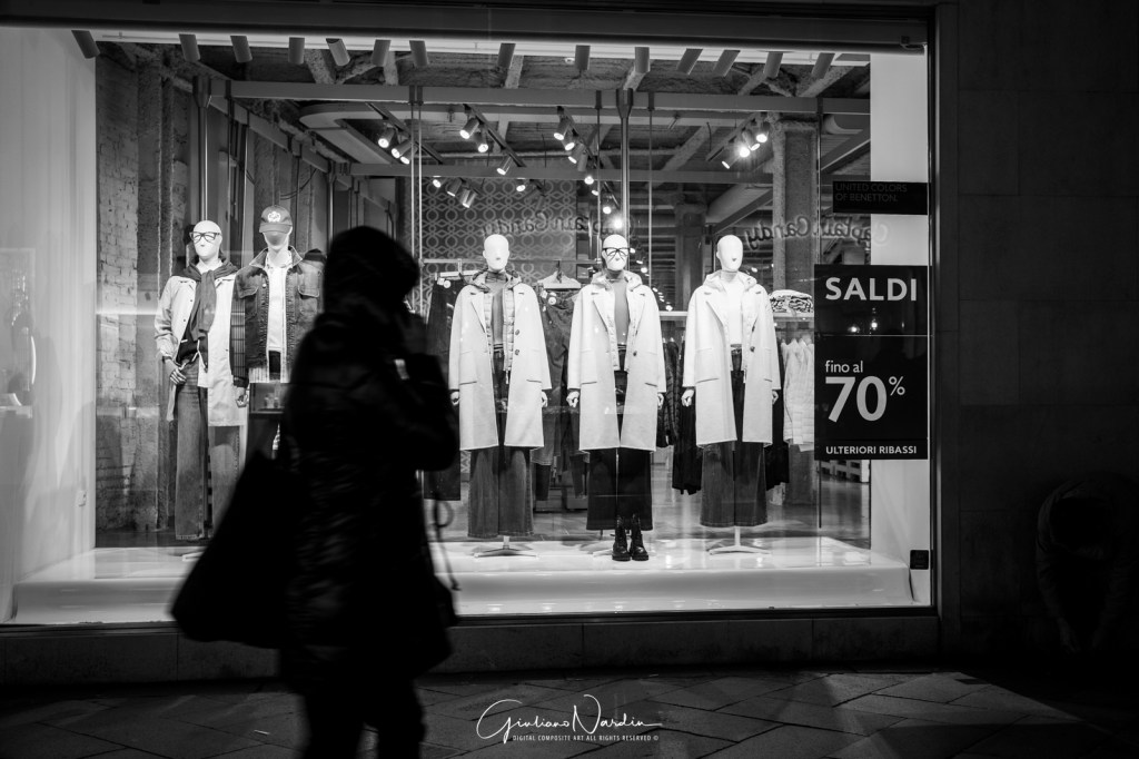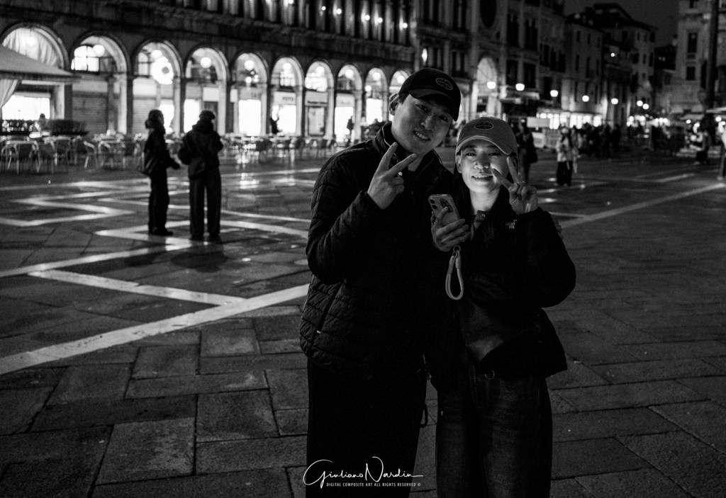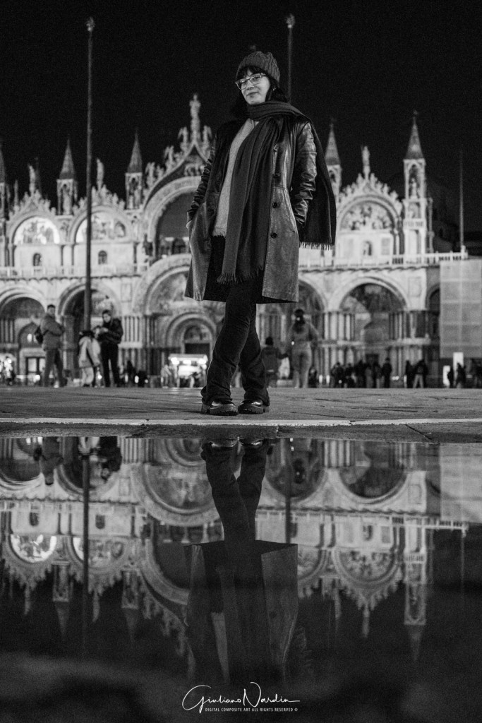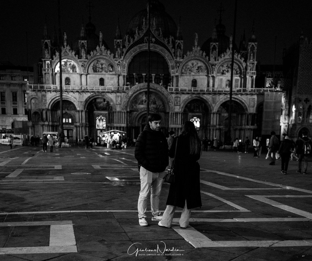 - La Venezia quotidiana: Le silhouette dei passanti che fluttuano sopra i propri riflessi, le luci fredde dei display degli smartphone che illuminano i volti, creando un ponte tra la storia millenaria e la nostra frenetica modernità.