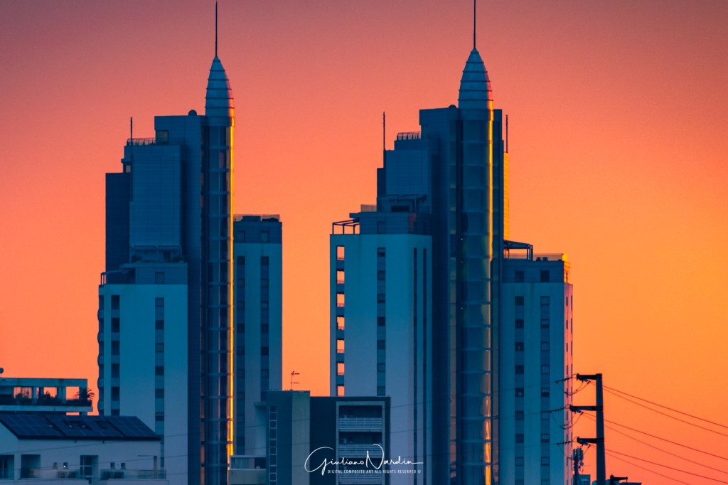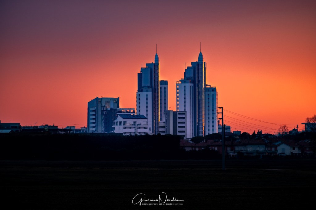 - Le Torri di Jesolo che tagliano l’orizzonte come lame scure, accendendosi solo sui profili.