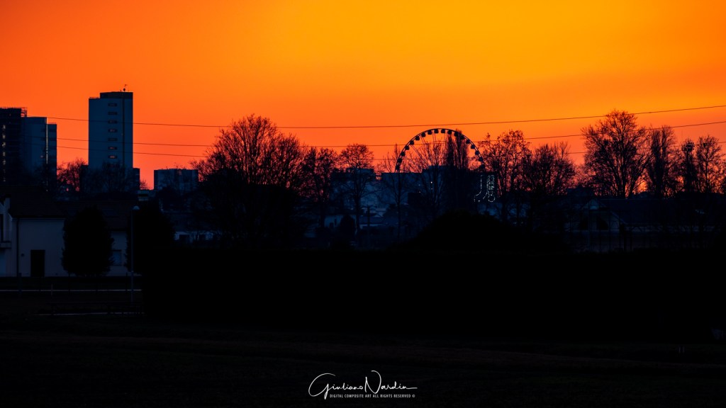 - La silhouette della ruota panoramica, un cerchio perfetto che rompe la linea retta delle case e dei tralicci.