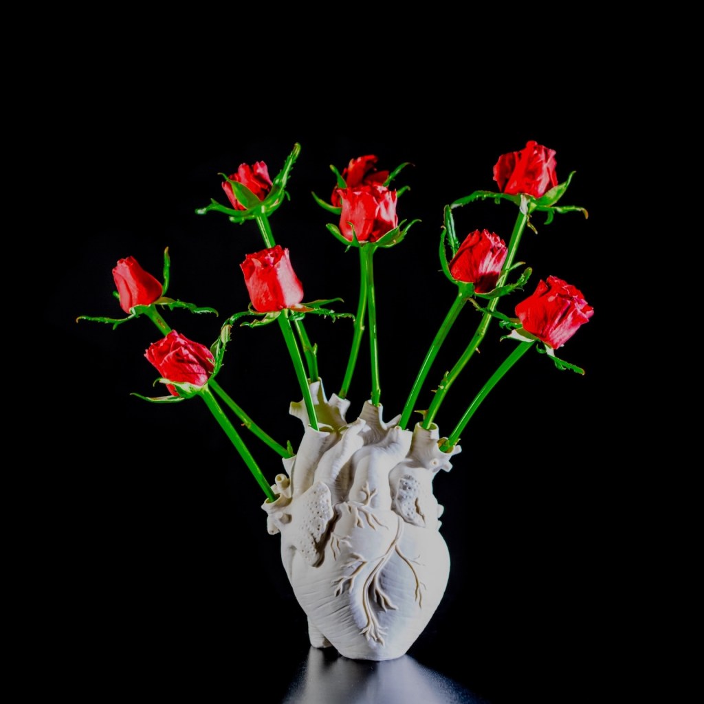 - The Heart of the Piece:ย The central image features an anatomical heart, white and sculptural. Instead of blood, it bursts with deep red roses on rigid stems.