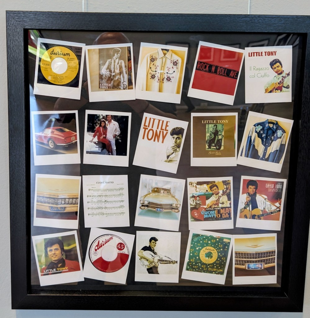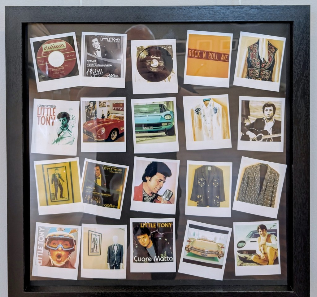 Le prime due opere del trittico sono una raccolta di istantanee, quasi un archivio della memoria. Ho voluto catturare l’essenza di Little Tony attraverso i suoi simboli: i dischi in vinile dellaย Durium, le giacche iconiche con le frange, le auto d’epoca e quel ciuffo inconfondibile. Usare il formato “Polaroid” per queste immagini serve a sottolineare il legame con un tempo che non c’รจ piรน, ma che resta vivido nel nostro immaginario collettivo.